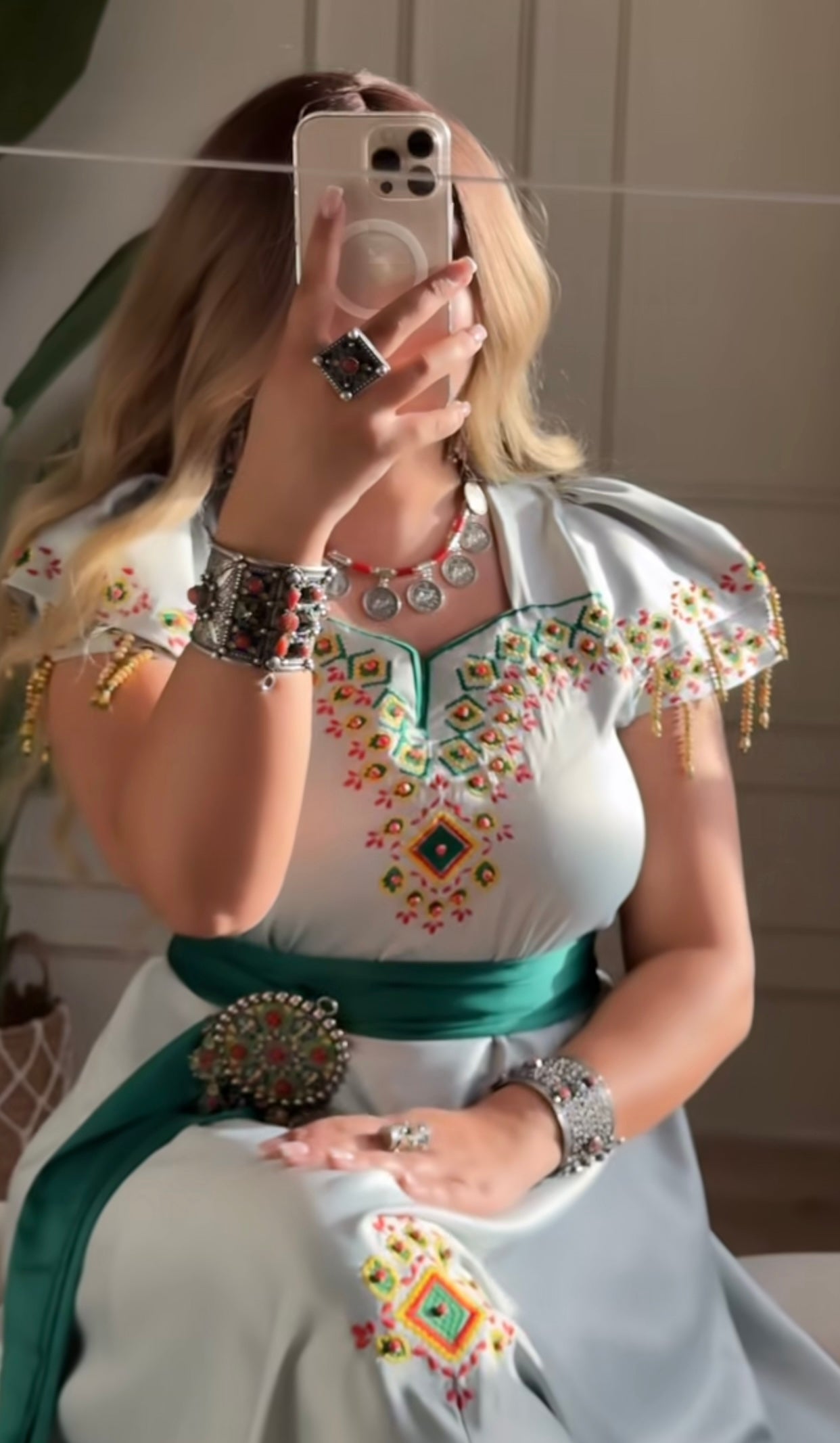 Robe en satin italien de haute qualité brodé et perlé avec ceinture en satin ✨